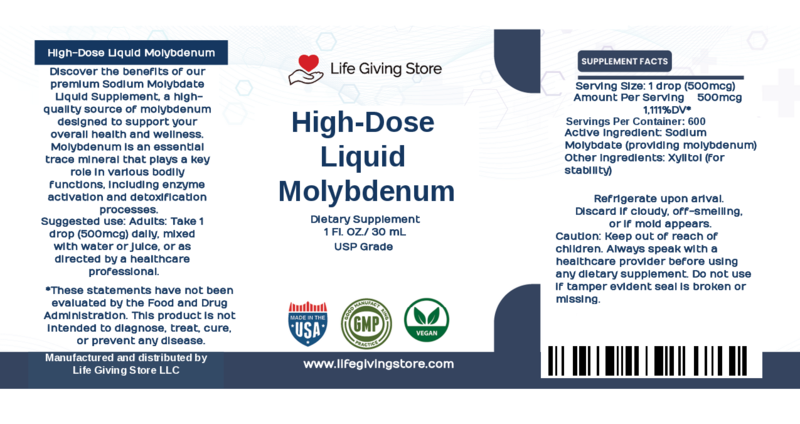 Discover the benefits of our premium High-Dose Liquid Molybdenum Supplement, a high-quality source of molybdenum designed to support your overall health and wellness. Molybdenum is an essential trace mineral that plays a key role in various bodily functions, including enzyme activation and detoxification processes. Our liquid formula ensures easy absorption and convenient dosing, making it an ideal addition to your daily routine.