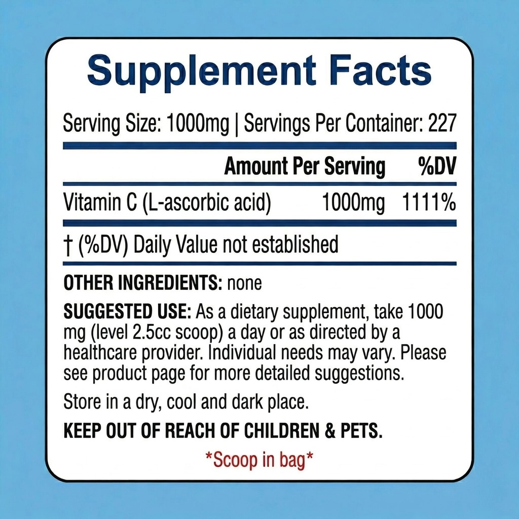 As a dietary supplement, take 1000 mg (level 2.5cc scoop), or as directed by a physician or healthcare provider. Doses should be divided. Best if mixed with 8-10 Ounces of juice. Reduce dose if stools become too loose or intestinal gurgling presents itself. Higher intakes may be optimal, consult your healthcare provider for guidance.